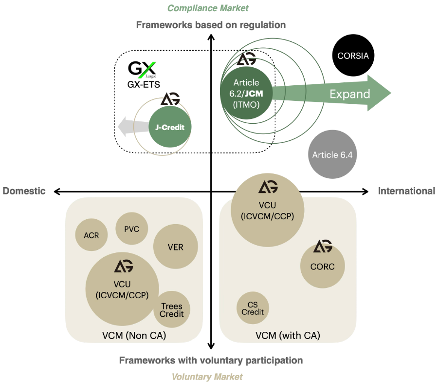 - Domestic: We build on a solid foundation of J-Credit and GX-ETS for domestic compliance needs.